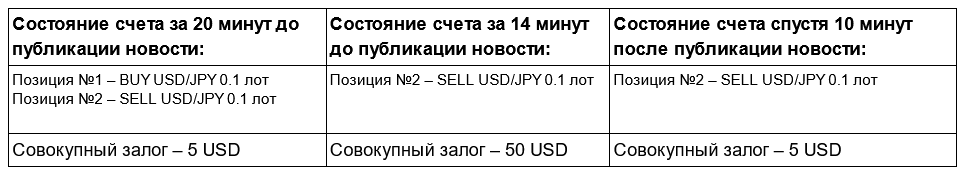- За 20 минут до публикации важных макроэкономических новостей на счете с установленным плечом 1:2000 открыта позиция №1 объемом 0.1 лот на покупку по инструменту USD/JPY и позиция №2 аналогичным объемом 0.1 на продажу по инструменту USD/JPY (разнонаправленные позиции). Совокупный залог по данным позициям составляет 5 USD. Спустя 6 минут позиция №1 закрывается, в результате чего будет произведен перерасчет маржинальных требований, и залог по позиции №2 составит 50 USD, так как закрытие позиции №1 произошло в новостной период. Спустя 10 минут после публикации важных макроэкономических новостей по позиции №2 будет произведен перерасчет маржинальных требований, в результате чего совокупный залог по позиции №1 составит 5 USD.