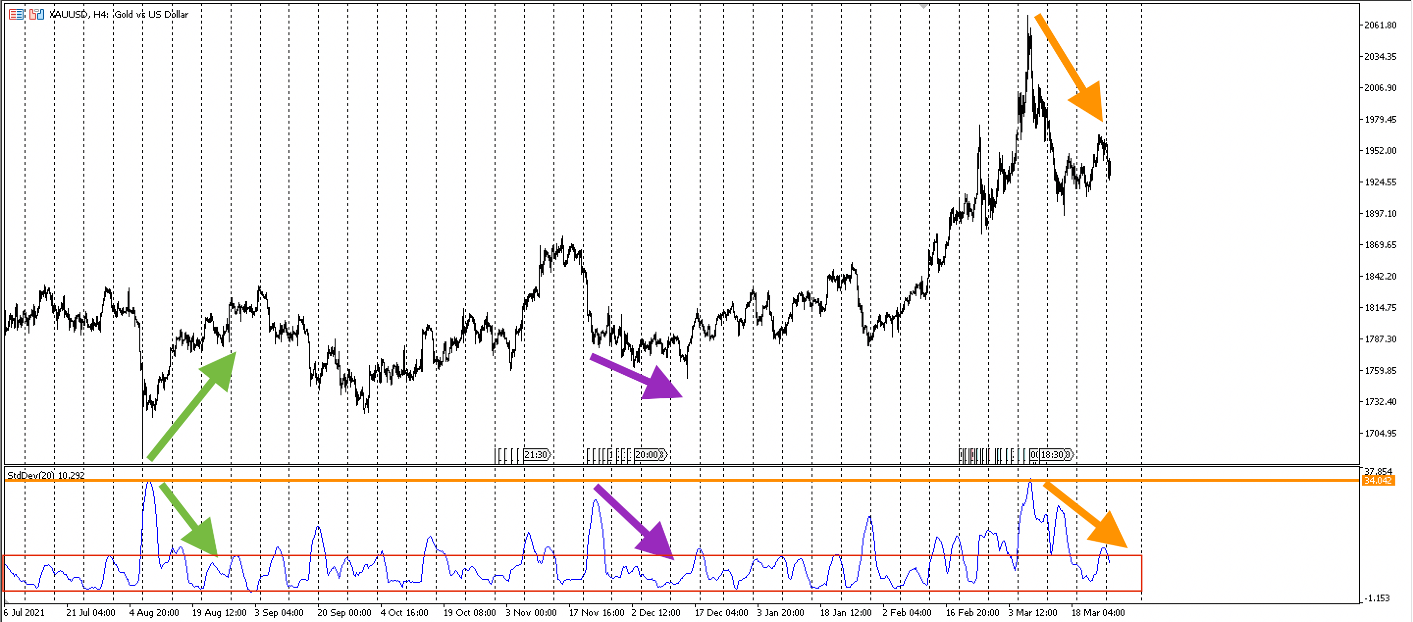 - оранжевые стрелки: после всплеска волатильности рынок разворачивается — котировки золота после роста начинают нисходящее движение, — и индикатор волатильности возвращается к стандартным значениям;