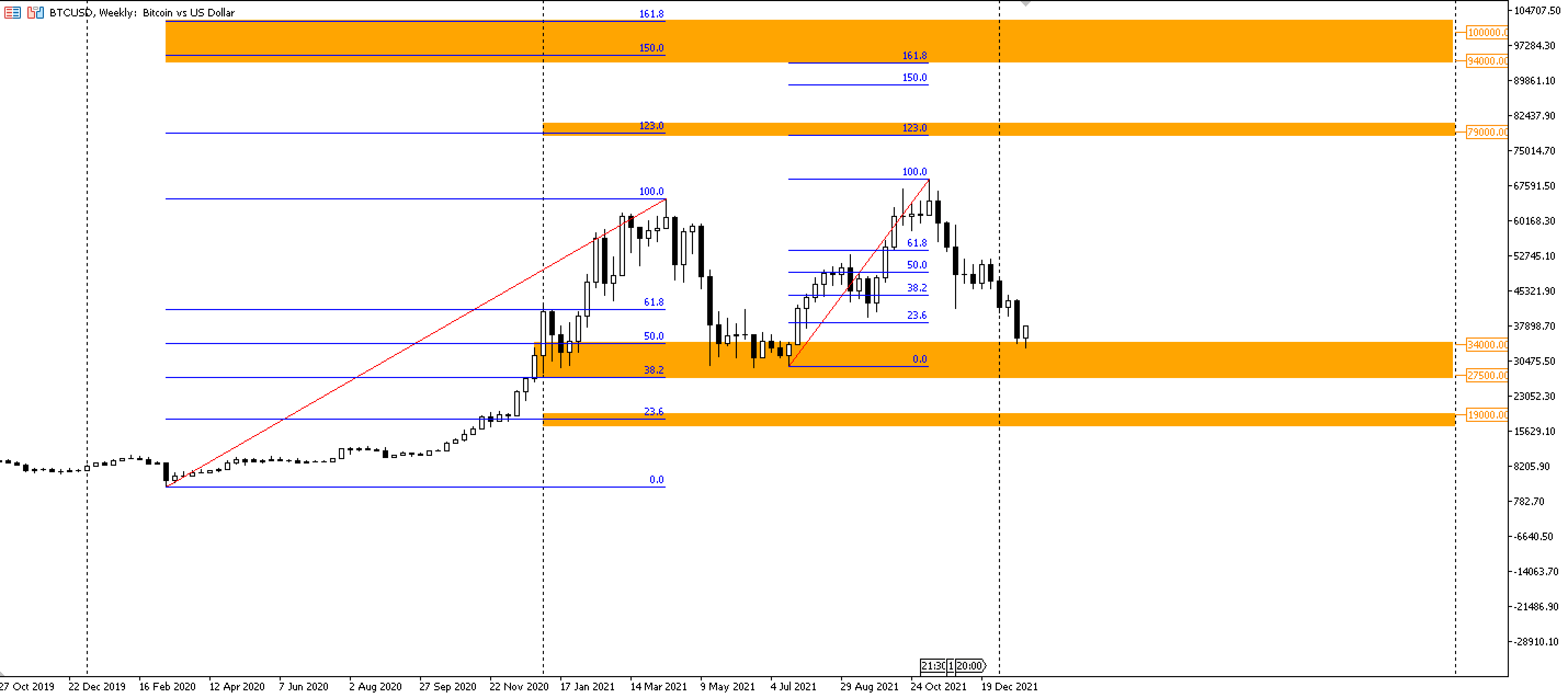 Ниже актуальных котировок продемонстрированы зоны поддержки, от которых можно ожидать восходящее движение. В случае если цена биткоина упадет ниже $27.5K, можно присматриваться к «покупкам» от уровня в $19K–$20K, который совпадает не только с синей линией Fibo в 23,6, но и с ценовым пиком 2017 г.