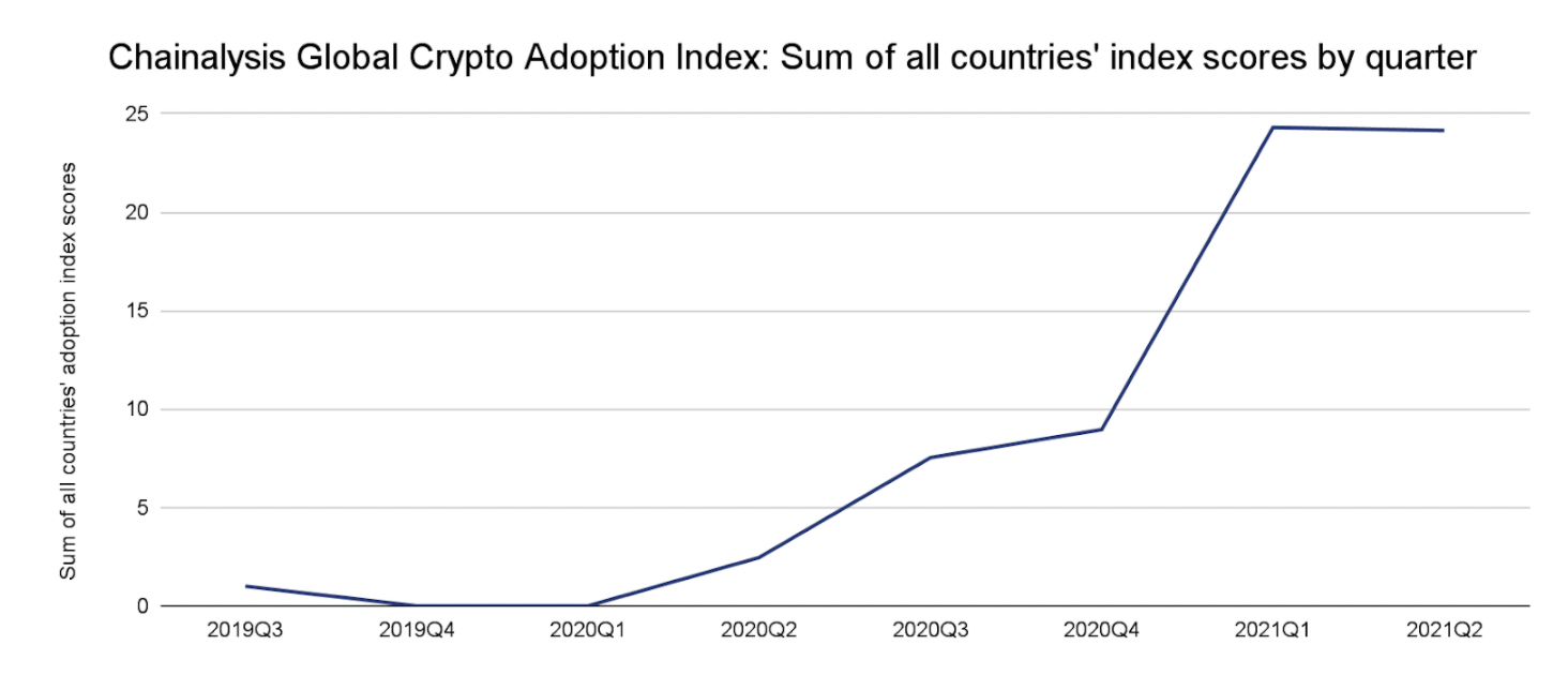 С начала 2020 г. начался колоссальный рост принятия криптоактивов населением большинства стран мира – в исследовании проводится анализ 154 государств. Со второго квартала 2020 г. по второй квартал 2021 г. индекс принятия вырос на 2300%. За это же время котировки Bitcoin выросли примерно с $9K до $64K.