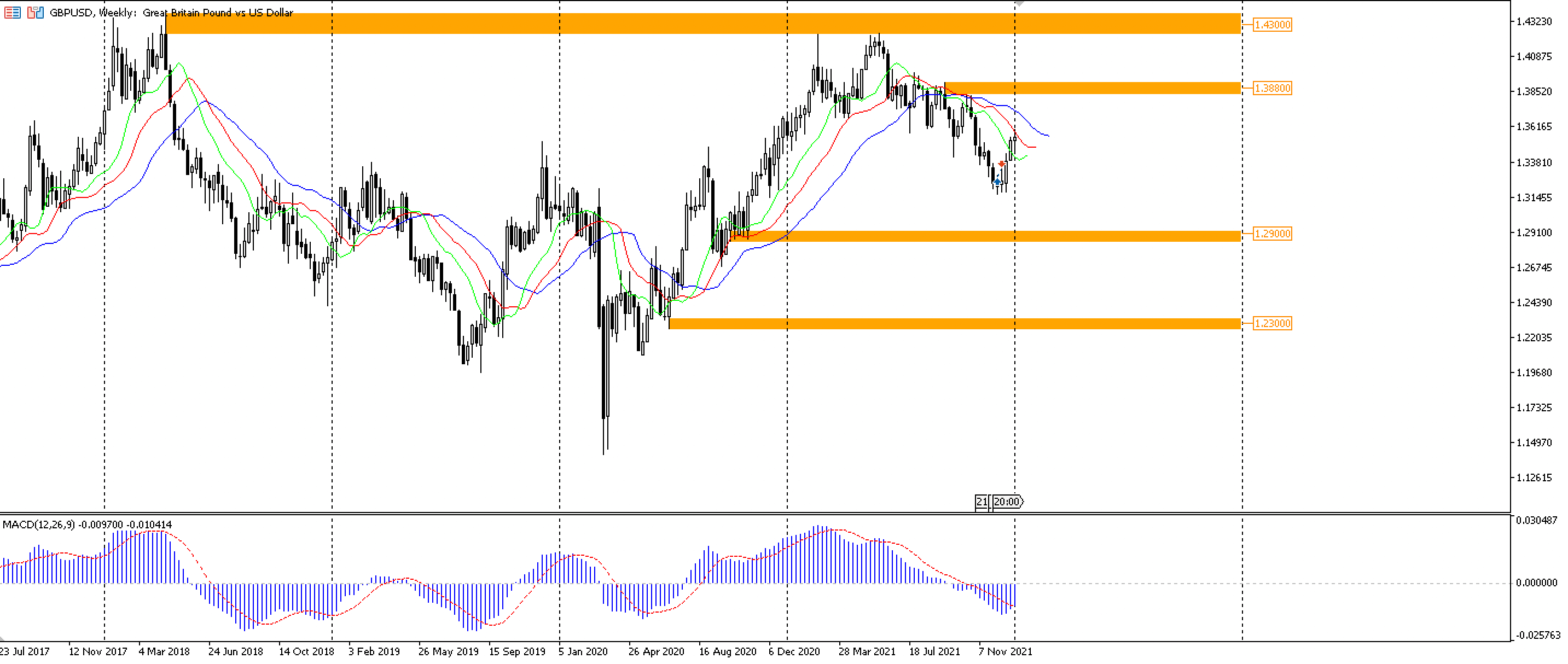Оранжевыми линиями проиллюстрированы зоны поддержки и сопротивления, от которых возможен отскок цены и разворот кратко- и среднесрочного тренда. Например, при достижении ценой уровня 1,38800 трейдер может искать сигналы на продажу, а при достижении 1,29000 – на покупку.