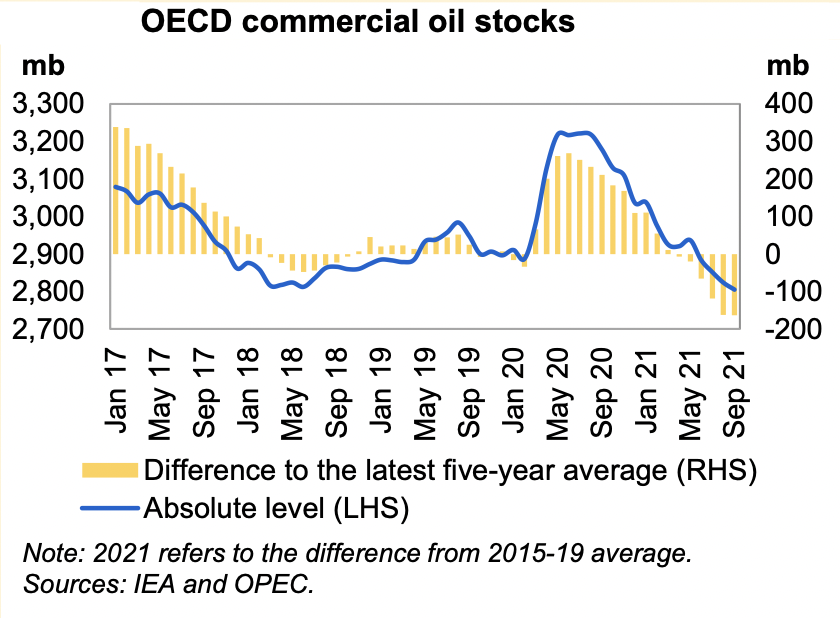 Динамика коммерческих запасов нефти ОЭСР с января 2017 г. по сентябрь 2021 г. Дата обращения: 10.12.2021. Источник: ежемесячный отчет по рынку нефти от ОПЕК за ноябрь 2021 г.
