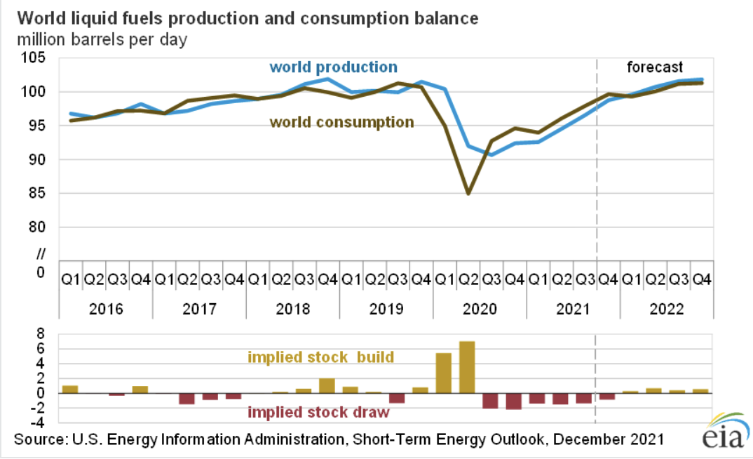 Управление энергетической информации США, прогноз соотношения спроса и предложения жидкого топлива на 2022 год. Дата обращения: 09.12.2021. Источник: eia.gov.