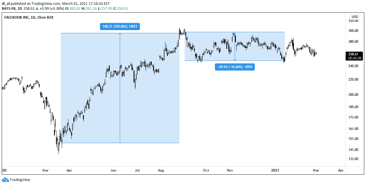 Рост акции Facebook начался в марте 2020 года. Он принес компании и ее инвесторам 100% прибыли. Согласитесь: цифра неслабая для любого рынка.