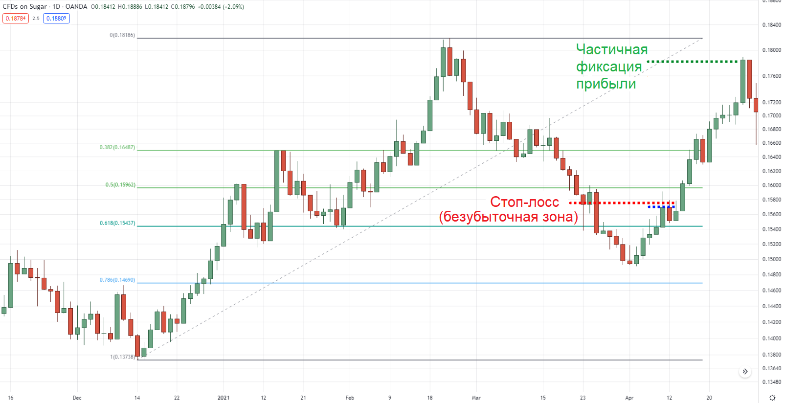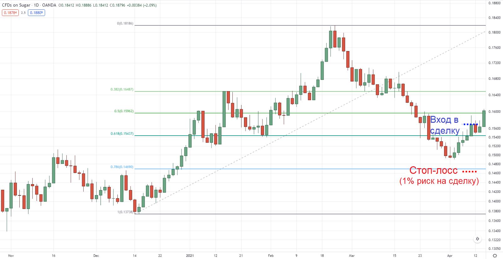 Настройка отката 61.8% на дневном таймфрейме графика сахара