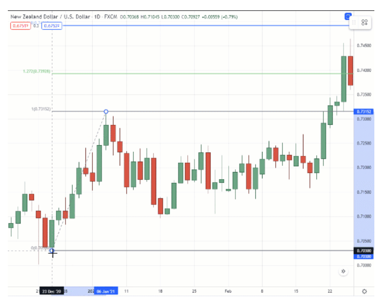 Поскольку мы используем инструмент восстановления Фибоначчи в трейдинге для определения времени разворота/отката, нужно измерить все трендовое движение, включая фитили свечей.