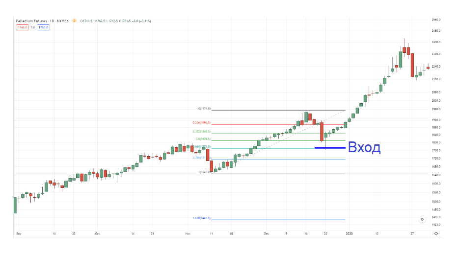 Вход по коррекции Фибоначчи на дневном таймфрейме палладия: