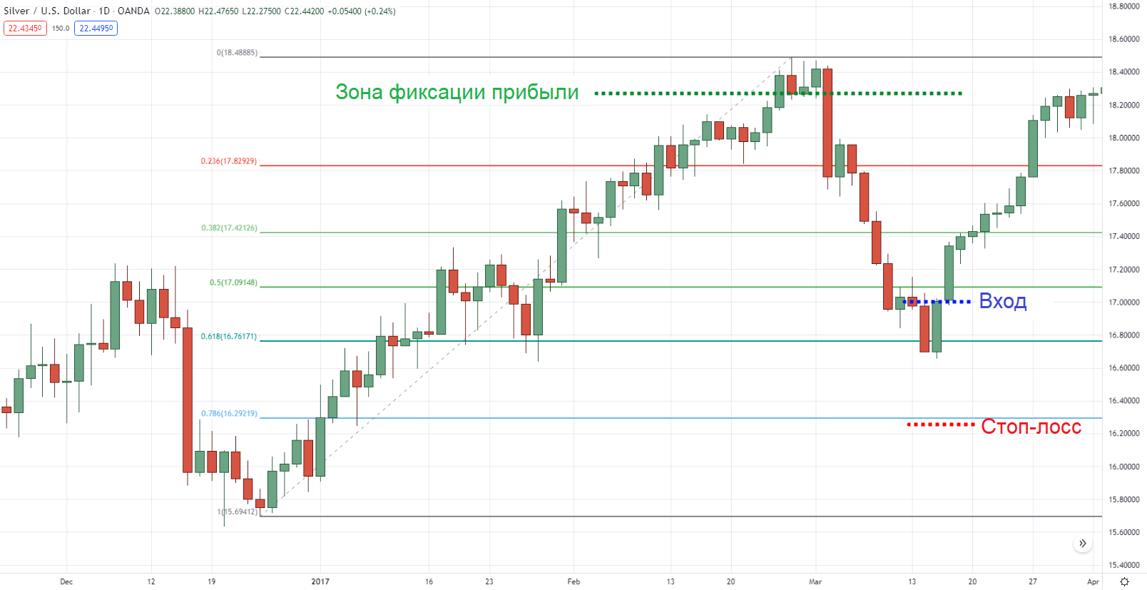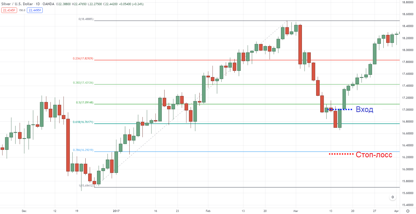 Начальный стоп-лосс 78,6% на дневном таймфрейме серебра: