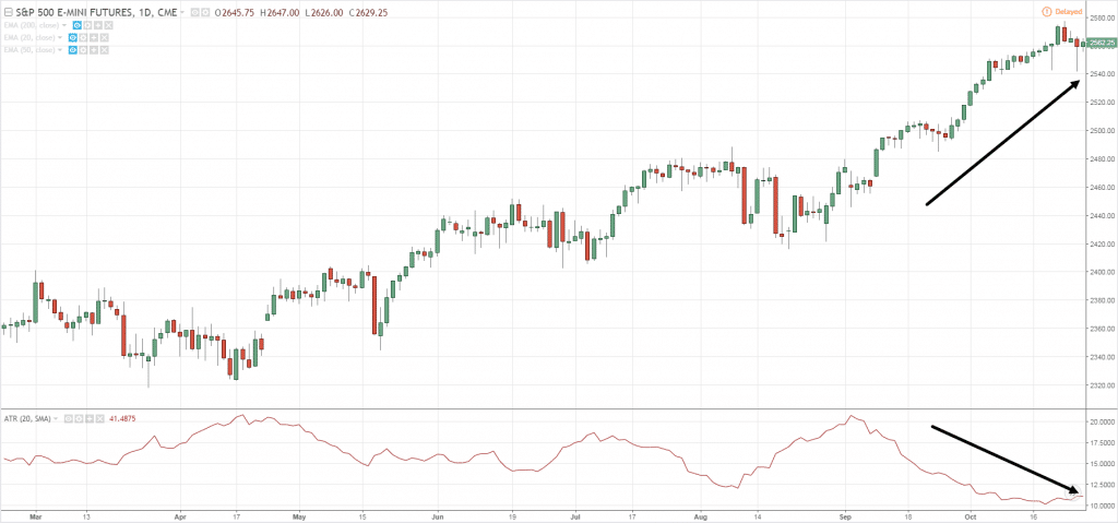 В качестве примера — S&P растет, а волатильность снижается…