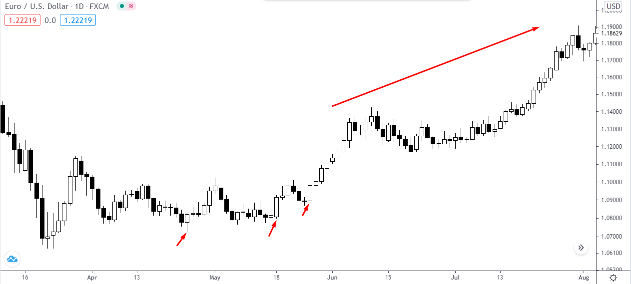 Такая свеча зовется «молот» и говорит нам, что продавцы выходят из рынка по низким ценам. За дело берутся покупатели, и, возможно, цена скоро вырастет. В нашем примере так и вышло.