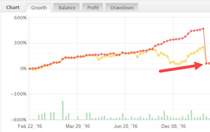 Здесь картинка не выглядит радужной — линия доходности упала вниз. И стратегия доходности уже не выглядит такой красивой.
