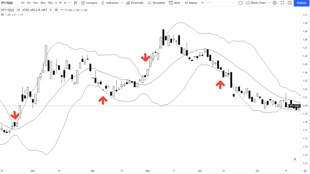 В нашем случае, если график соотношения достигнет нижней полосы, нужно купить SPY и открыть короткую позицию по QQQ.