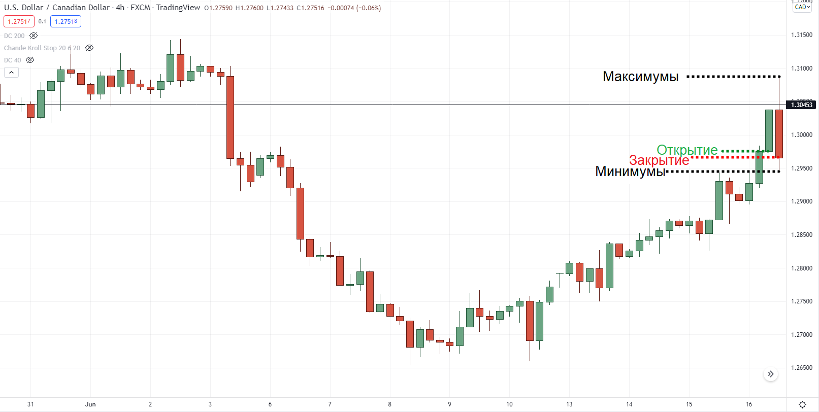 Верхний фитиль означает самое высокое максимальное значение периода, а нижний фитиль — самое низкое.