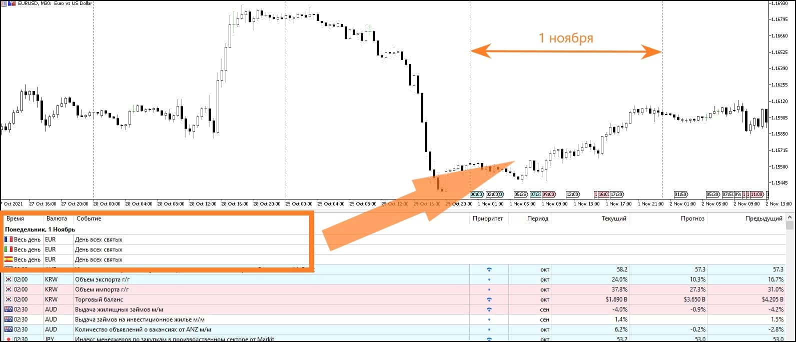 На рисунке выше продемонстрирована динамика валютной пары EUR/USD во время праздничного дня 1 ноября и за несколько дней до этого. Важно отметить, что во многих других странах Европейского союза 1 ноября был рабочим днем, поэтому активность трейдеров и инвесторов из ЕС не прекратилась полностью.