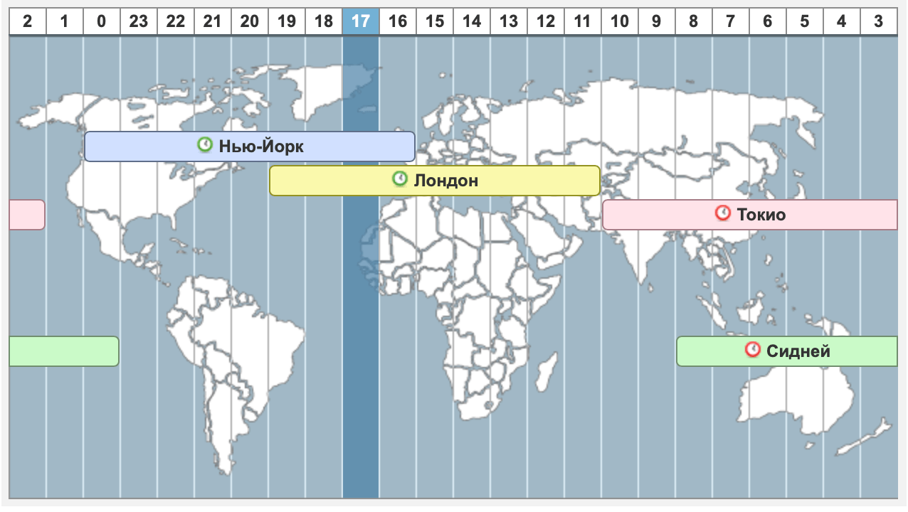 При определении графика торговли важно учитывать время работы конкретных рынков и бирж. Выше представлен график работы валютного рынка, показывающий, в какое время на рынке присутствует наибольшее количество трейдеров из соответствующего региона.