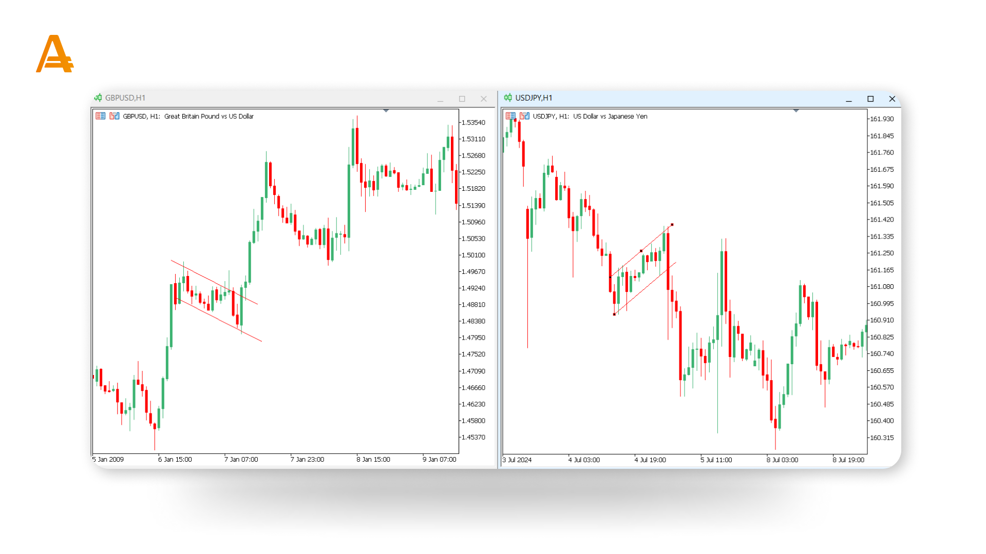 Бычьи флаги. Эти фигуры появляются во время восходящего тренда, демонстрируя короткую паузу перед вероятным продолжением роста цены. Визуально они напоминают небольшие прямоугольники, наклоненные вниз. Когда цена прорывается выше флага, это обычно сигнализирует о возобновлении восходящего тренда, что потенциально создает возможность для покупки.