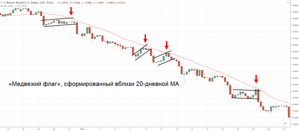«Флаг медведя» — паттерн продолжения основного медвежьего тренда. Не стоит торговать фигуру в том случае, если цена находится вдали от «скользящей средней».