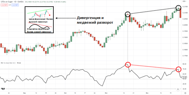 На графике можно наблюдать медвежью разворотную дивергенцию.