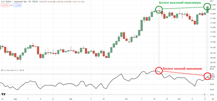 Итак, теперь, имея в распоряжении эти два важных блока информации, где цена формирует новое более высокое максимальное значение, а индикатор — новое более низкое максимальное, мы можем значительно больше: