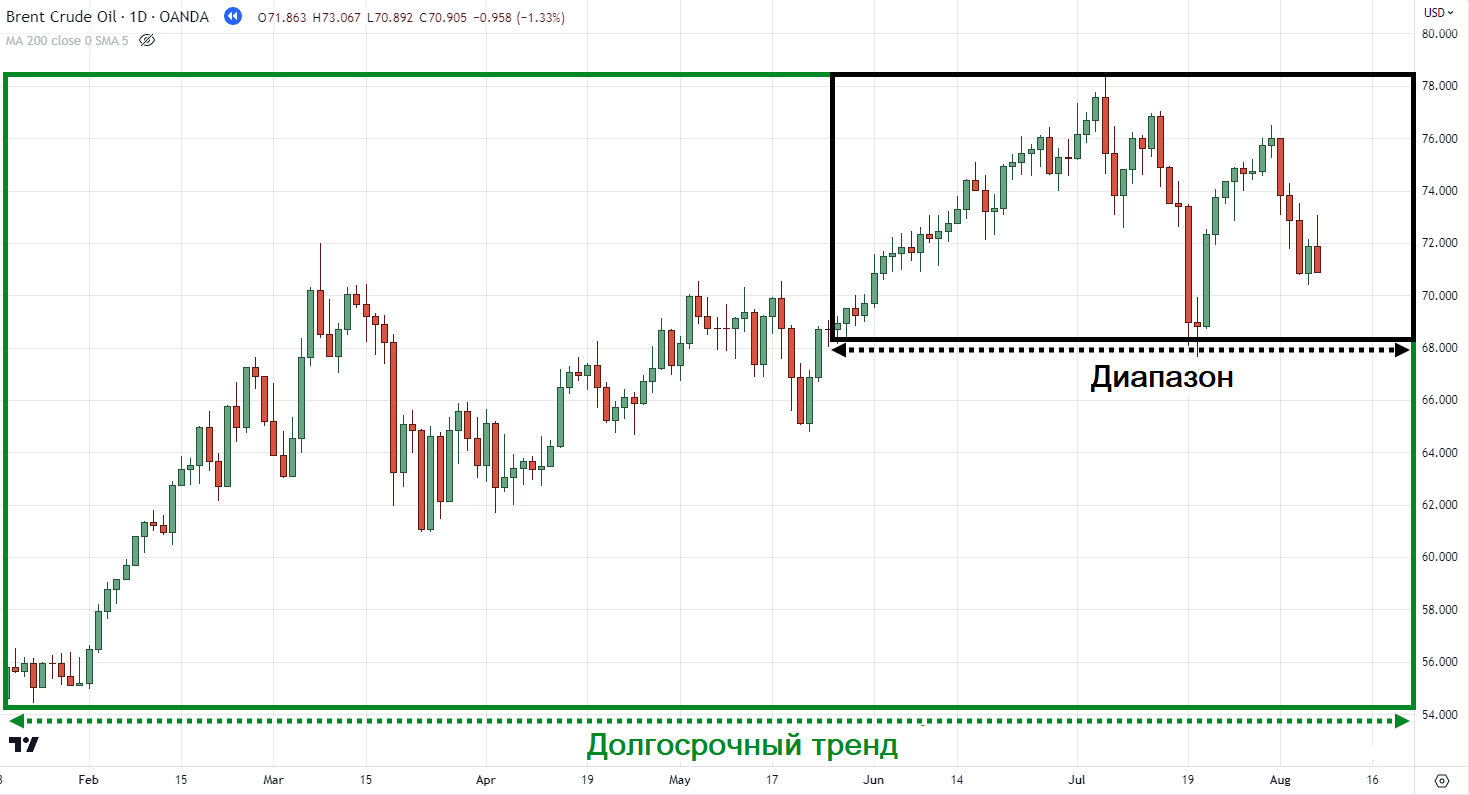 Посмотрим на примере дневного таймфрейма и нефти Brent: