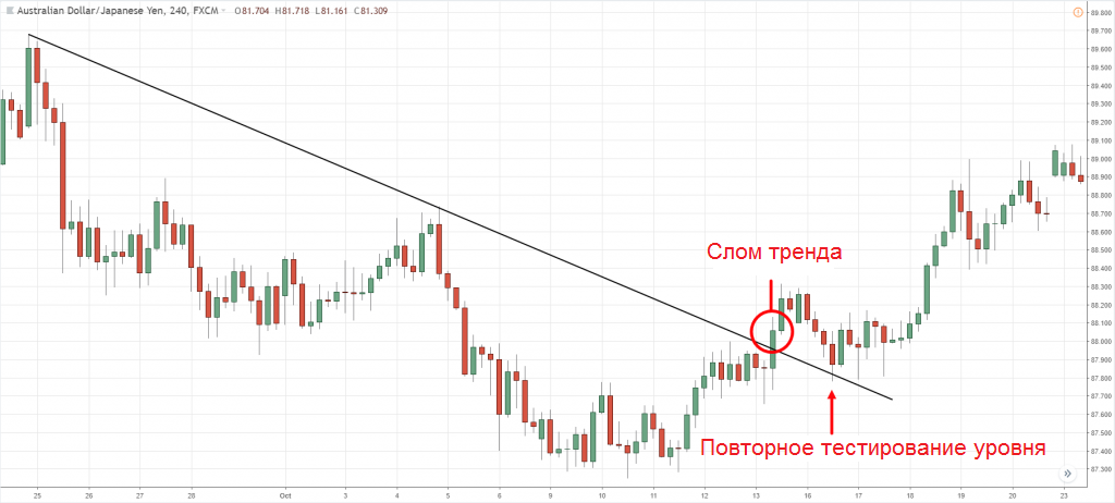 Если линия тренда прорывается, можно дождаться повторного тестирования уровня и посмотреть, выдержит ли тренд. Если выдержит, рынок, скорее всего, развернется в противоположном направлении.