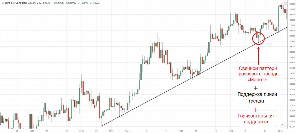 Например, можно использовать разворотные свечные модели («Молот», «Бычье поглощение» и т. д.) в качестве сигнала для входа. Это означает, что вы будете открывать сделку только в момент, когда рынок «отскочит» от линии тренда и с большой вероятностью пойдет вверх.