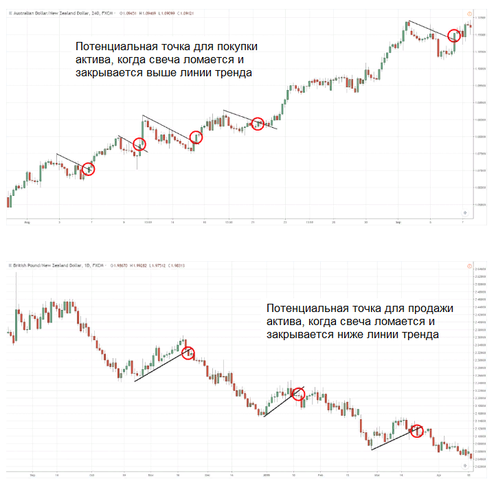 Техника прорыва линии тренда помогает определить время входа на трендовый рынок.