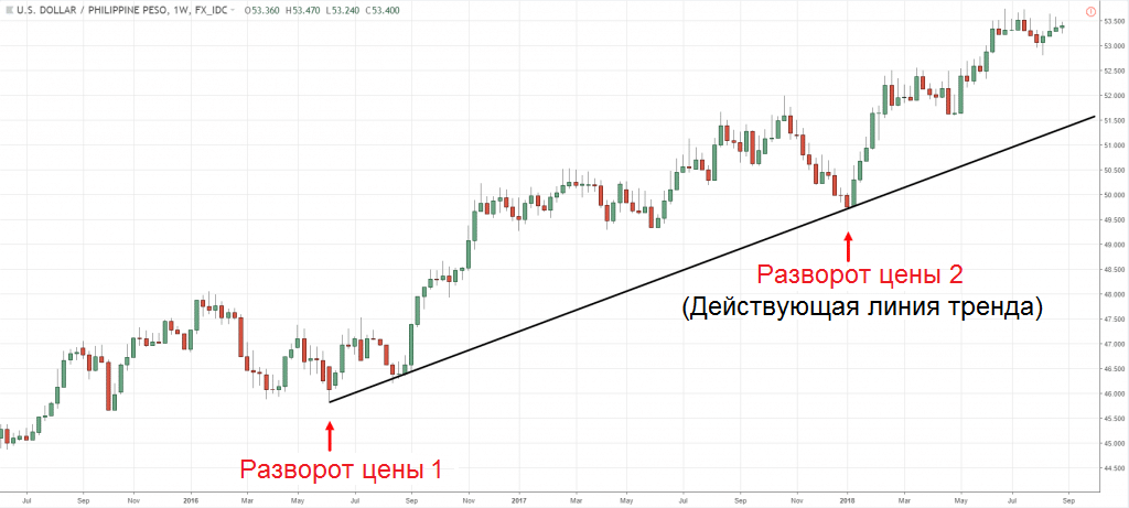 Если линия нарисована от левого нижнего угла к правому верхнему, то рынок находится в восходящем тренде, и наоборот.