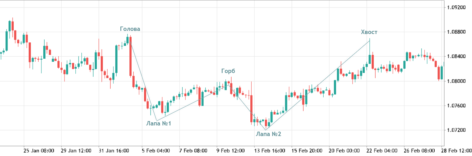 - Вы можете увидеть, что вторая «лапа» расположена ниже первой. Относительно этого нюанса среди трейдеров встречаются разные точки зрения. Например, некоторые считают, что они должны располагаться на одном уровне, а другие говорят, что ниже должна находиться первая лапа. В данном случае мы рекомендуем пробовать разные варианты, так как однозначного ответа не существует.
