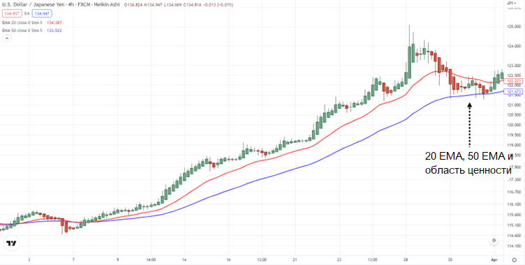 - Дождитесь откатного ценового движения в область ценности, используя 20ЕМА и 50ЕМА на младшем графике.