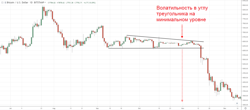 Верхняя часть треугольника символизирует минимальную волатильность в области треугольника. Можно заметить, как цена сжимается до тех пор, пока не «вырвется» из треугольника. Это сжатие работает на вас, поскольку цена в таких условиях может быстро перейти на вашу сторону (с небольшой просадкой или даже без нее).