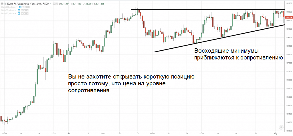 - Продавцы не давят на рынок. Когда продавцы начинают массированно давить на рынок, цена не имеет шанса долго оставаться на линии сопротивления. Она довольно быстро начинает снижаться. Если цена все еще около «сопротивления», это значит, что продавцы не доминируют в настоящий момент.