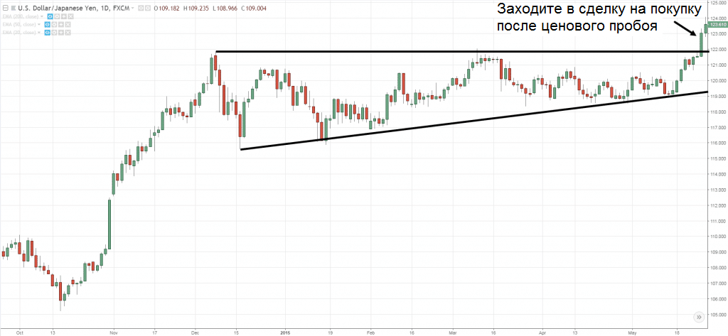 Если вы уверены в своем опыте, можно пробовать метод торговли, ориентированный на точки прорыва. Как это работает? Вы покупаете, когда цена вновь касается линии тренда.