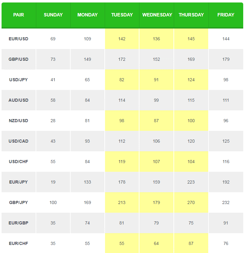 - Середина недели чаще генерирует максимально объемную торговлю на фоне расширения диапазона пунктов по большинству пар.