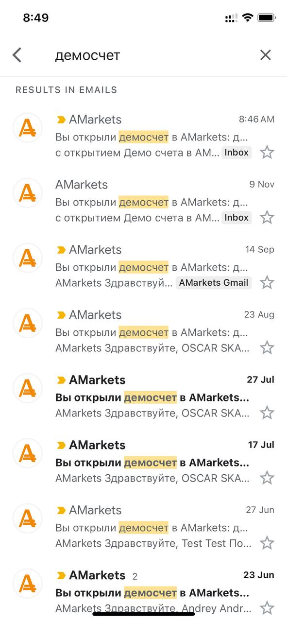 Войдите в свой email и в строке поиска введите заголовок «Вы открыли демо счет в AMarkets»: