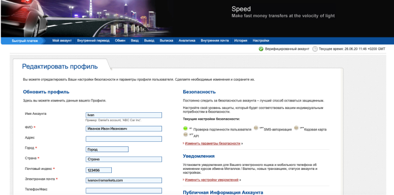 На странице с персональной информацией должны быть видны ФИО, адрес, номер телефона, email, знак верификации вашего аккаунта и номера счетов. ФИО и номер телефона должны совпадать с данными в Личном кабинете AMarkets.